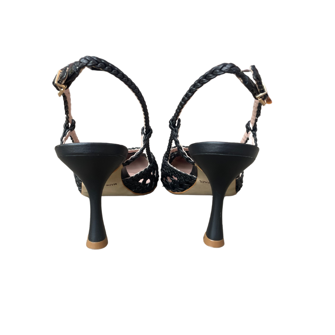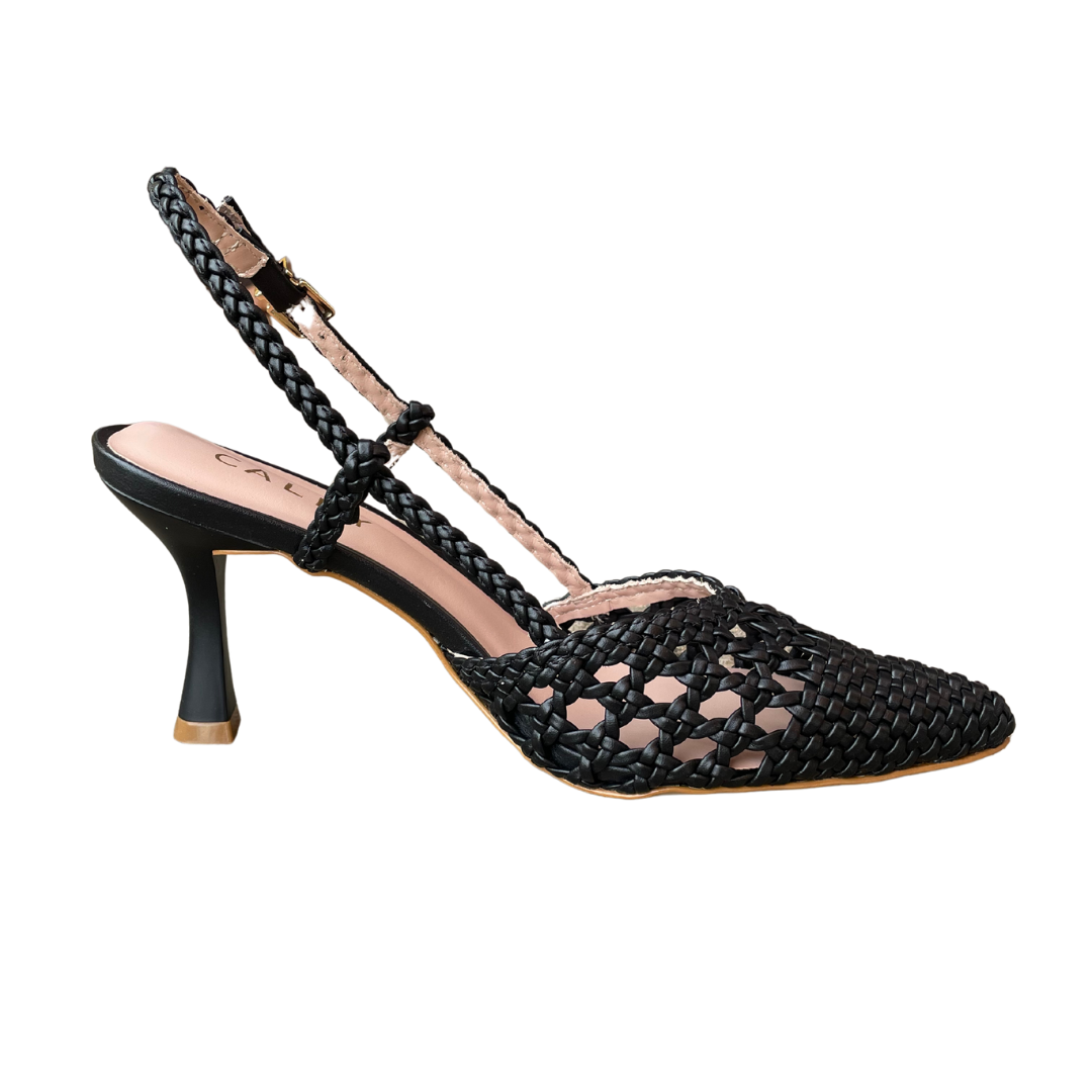 Step into effortless style with these black braided slingback heels, designed for both elegance and comfort. Crafted with a unique braided design, these heels offer a chic, sophisticated look that pairs seamlessly with any summer outfit. The breathable material ensures your feet stay cool, even on the hottest summer nights. With a secure slingback strap and a stylish heel, these shoes are perfect for everything from evening events to casual nights out.