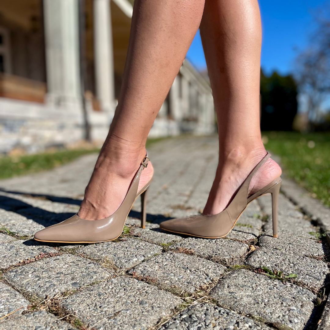 Elevate your Fall wardrobe with our classic Elisa Taupe Slingback Patent Leather Pump. Its multifaceted design in a neutral taupe hue will be a versatile staple for any occasion. Add a touch of sophistication and style to your look with these must-have pumps. You will be wearing them on repeat, don't be fooled by the simple design this shoe is a showstopper.