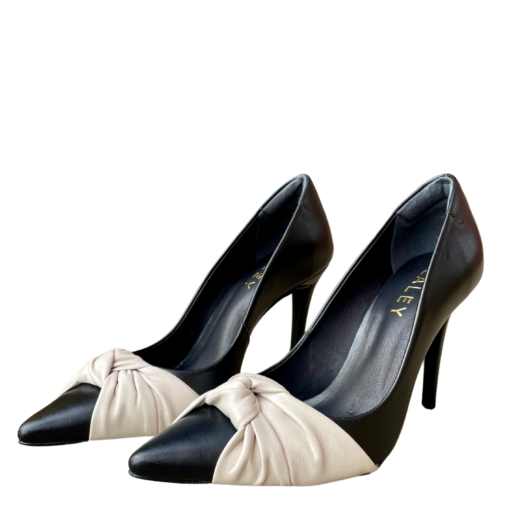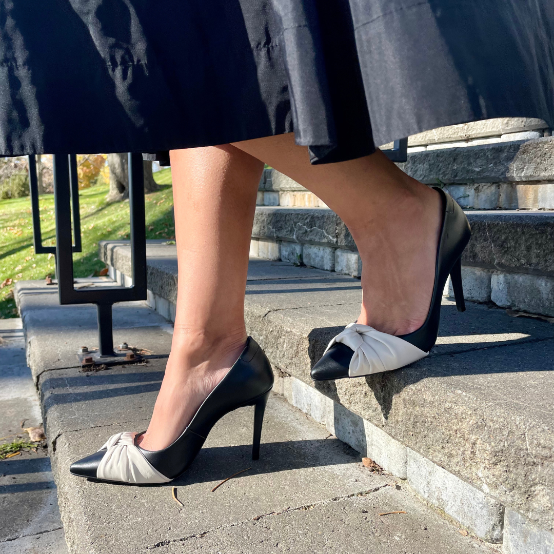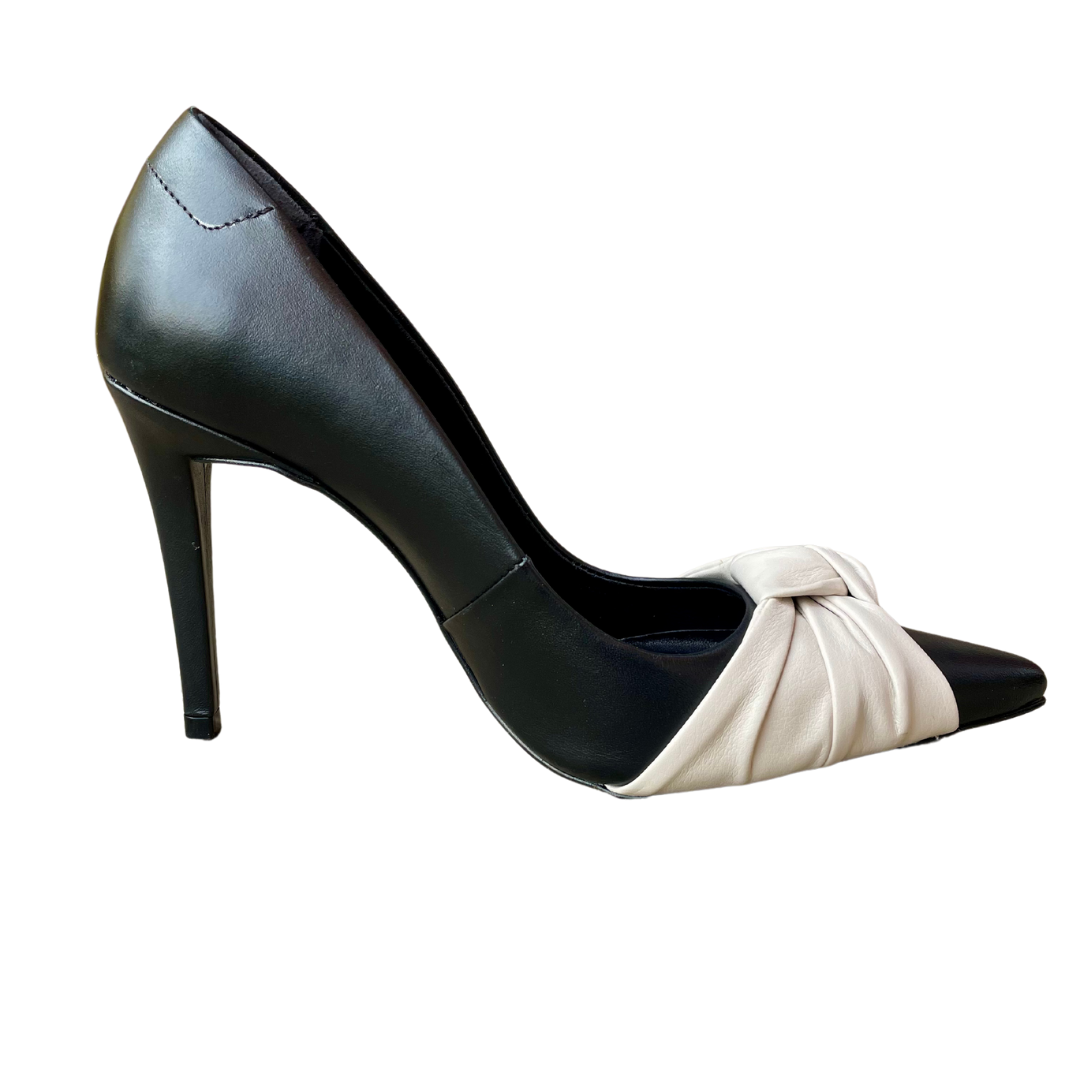 Indulge in ultra feminine style with the Pina Leather Pump. Made from premium nappa leather, this sophisticated two-tone pump features a sleek pointy toe and slim heel with a white knot for completing any black and white look.