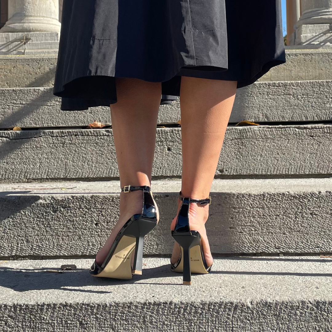Elevate your style with the Valentina Black Ankle Strap Heel. Crafted from classic patent leather, this heel exudes sophistication and pairs effortlessly with any outfit. The ankle strap adds a touch of elegance while ensuring a comfortable fit. Pointy toe design adds a contemporary touch. Perfect for those seeking a luxurious and versatile shoe. Pairs beautifully with a dressy or more casual denim look.