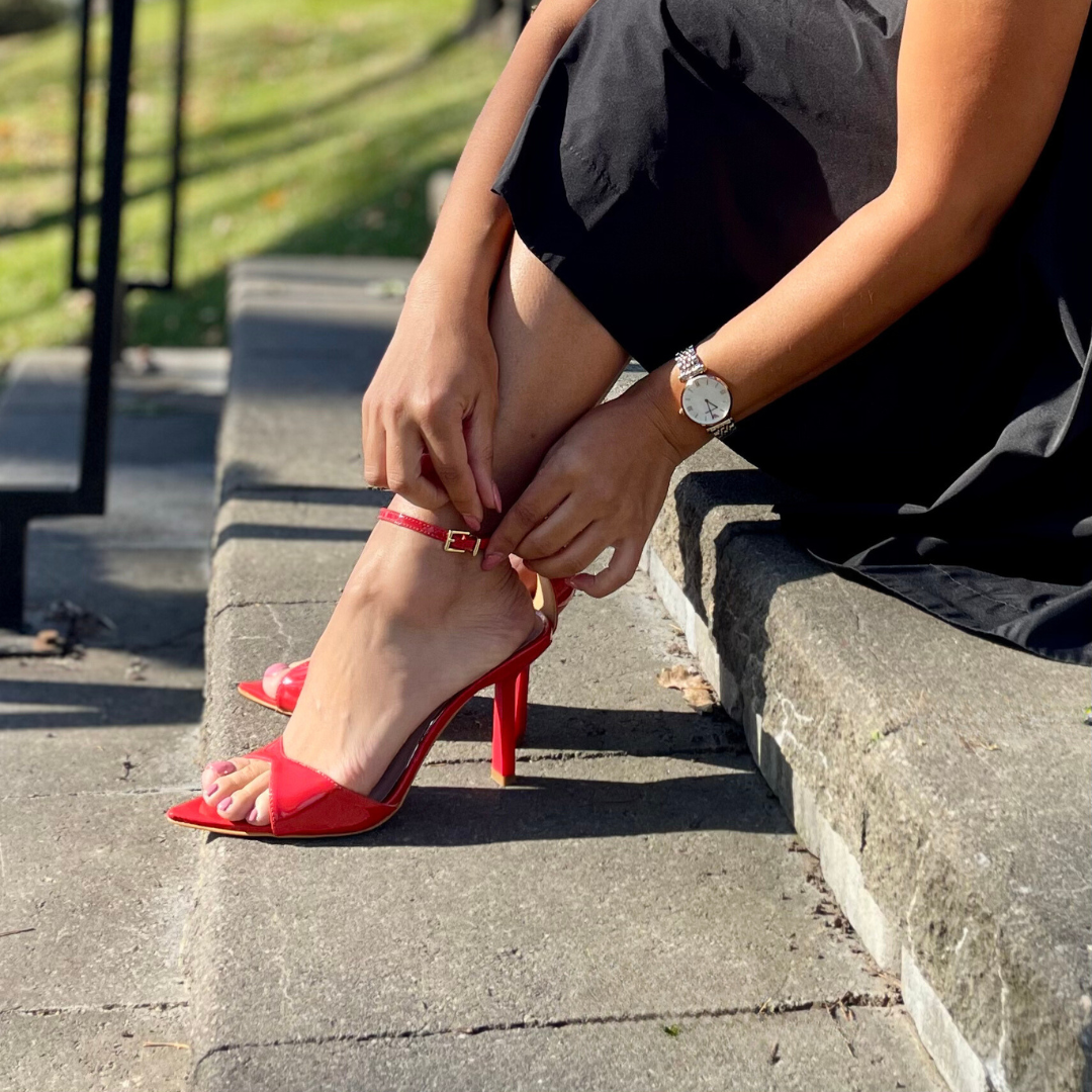 Step up your evening style with the Valentina Ferrari Red Ankle Strap Heel. The perfect balance of simple elegance and bold color, this heel is the ultimate accessory for a night out. The sleek ankle strap adds a touch of sophistication, while the vibrant red hue makes a statement. Elevate your look and turn heads with Valentina in Ferrari Red.